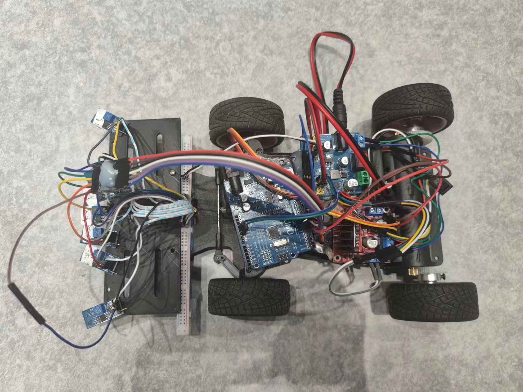 analogWrite(motor1,motor1_speed); analogWrite(motor2,motor2_speed); } void loop() { if(zhijiao == 0){ zhijiao = 1; analogWrite(motor2,80); delay(1800); myservo.write(40); analogWrite(motor2,100); delay(1000); } if((hu == 0 && zhijiao == 1 && digitalRead(infrared[0])==black && digitalRead(infrared[3])==black) || (hu == 0 && zhijiao == 1 && digitalRead(infrared[1])==black && digitalRead(infrared[3])==black)){ hu = 1; analogWrite(5,0); analogWrite(6,0); analogWrite(11,100); myservo.write(70); delay(1800);